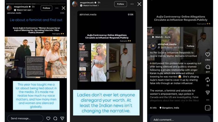 Ms Gori Music नाम से जानी जाने वाली कनाडियन आर्टिस्ट ने सोशल मीडिया पर करण औजला पर कई गंभीर आरोप लगाए थे। वायरल हो रहे स्क्रीनशॉट्स में उन्होंने दावा किया कि वह हॉलीवुड फिल्म इंडस्ट्री से जुड़ी हैं और करण औजला के साथ निजी रिश्ते में थीं। आर्टिस्ट का कहना है कि उन्हें इस बात की जानकारी नहीं थी कि करण पहले से शादीशुदा हैं।