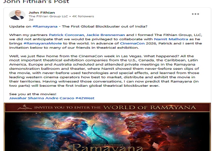 जब मेरे पार्टनर्स पैट्रिक कोरकोरन, जैकी ब्रेनेमैन और मैंने 'द फथियन ग्रुप, LLC' बनाया था, तब हमें अंदाज़ा नहीं था कि हमें नमित मल्होत्रा के साथ काम करने का मौका मिलेगा, जो #RamayanaMovie को दुनिया के सामने ला रहे हैं। सिनेमाकॉन 2026 से पहले, पैट्रिक और मैंने थिएट्रिकल एग्जीबिशन से जुड़े अपने कई दोस्तों को नीचे दिया गया न्योता भेजा था।