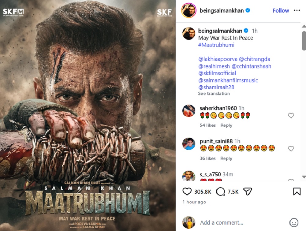 फिल्म का नाम पहले ‘बैटल ऑफ गलवान’ रखा गया था, जिसे बाद में बदलकर ‘मातृभूमि’ कर दिया गया। फिल्म में सलमान खान के साथ चित्रांगदा सिंह लीड रोल में नजर आएंगी। वहीं, यह भी चर्चा है कि गोविंदा इस प्रोजेक्ट का हिस्सा बन सकते हैं। फिलहाल फिल्म की शूटिंग जारी है, लेकिन नई रिलीज डेट को लेकर मेकर्स ने अभी तक कोई आधिकारिक घोषणा नहीं की है। ऐसे में फैंस को ‘मातृभूमि’ के लिए थोड़ा और इंतजार करना पड़ सकता है।